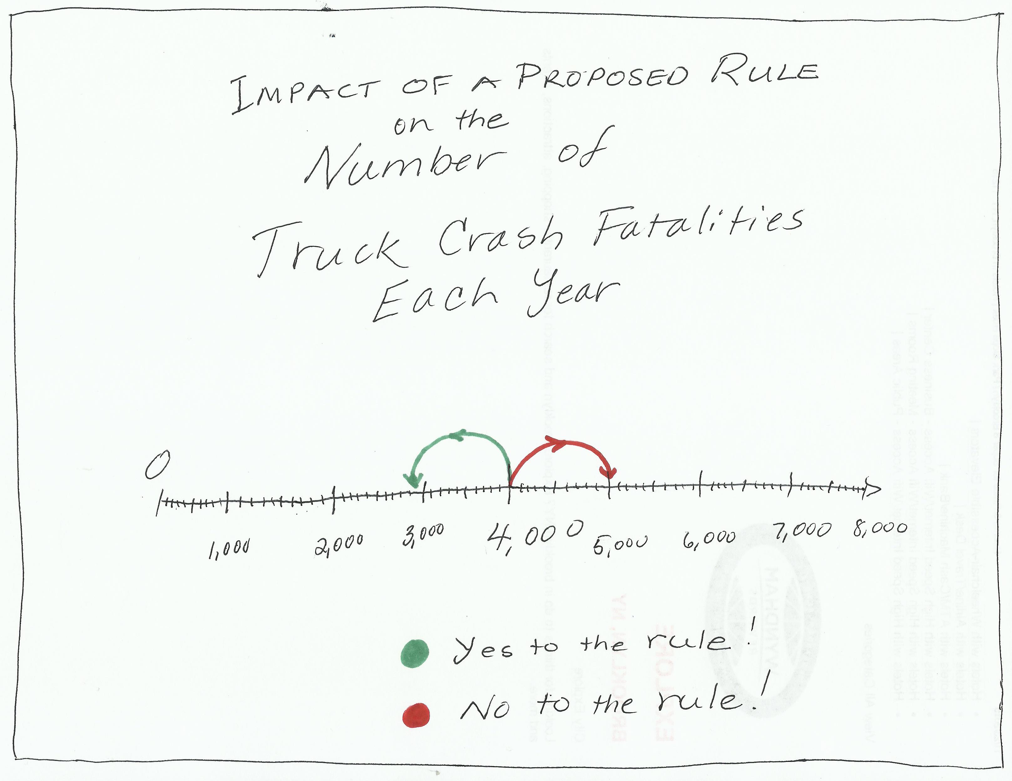 I thought of a very simple way of illustrating how I think that decisions should be made on highway safety rulemaking: a number line. For example, with rules impacting the trucking industry, the starting point would be the average annual truck crash fatality rate of 4,000.